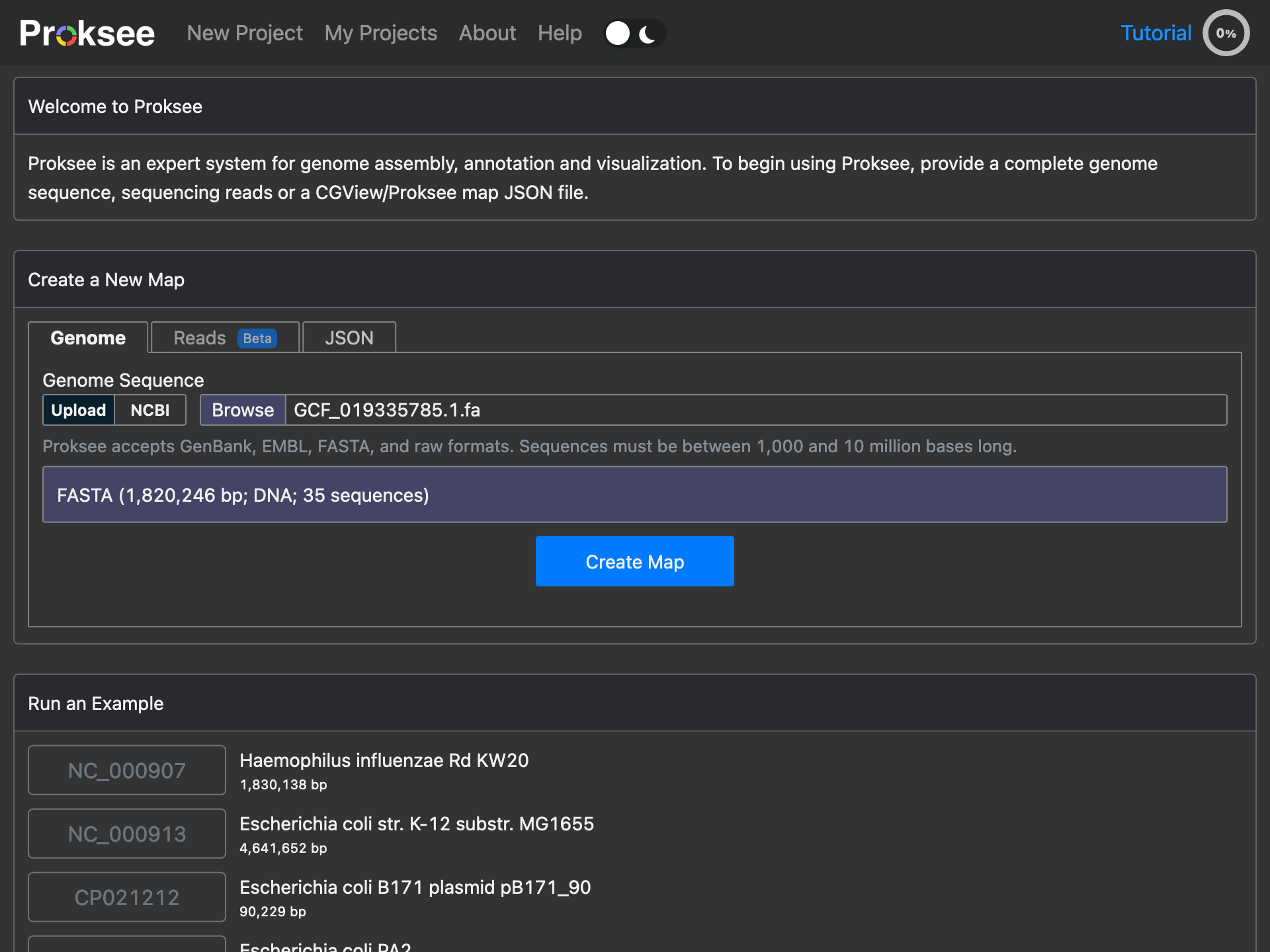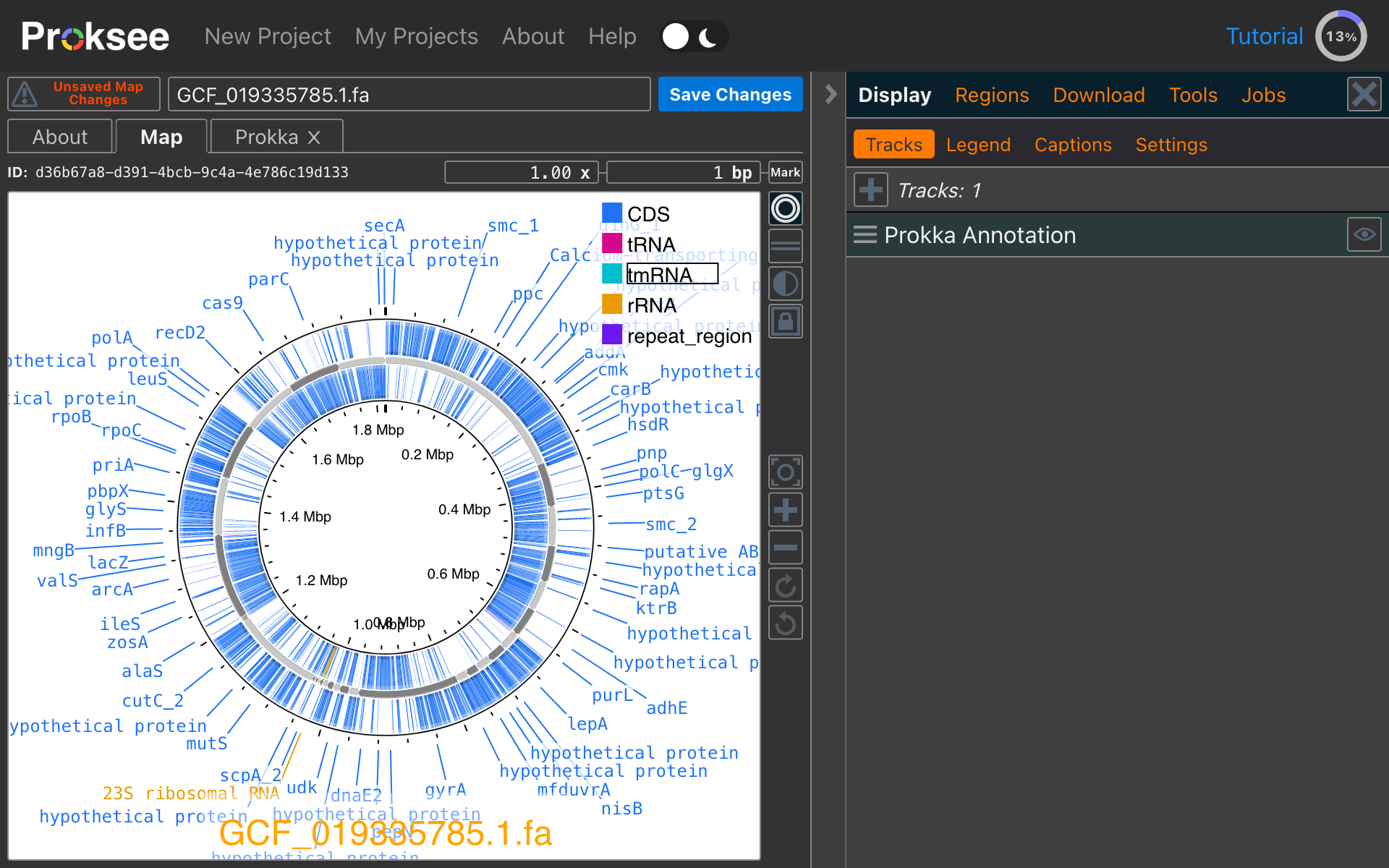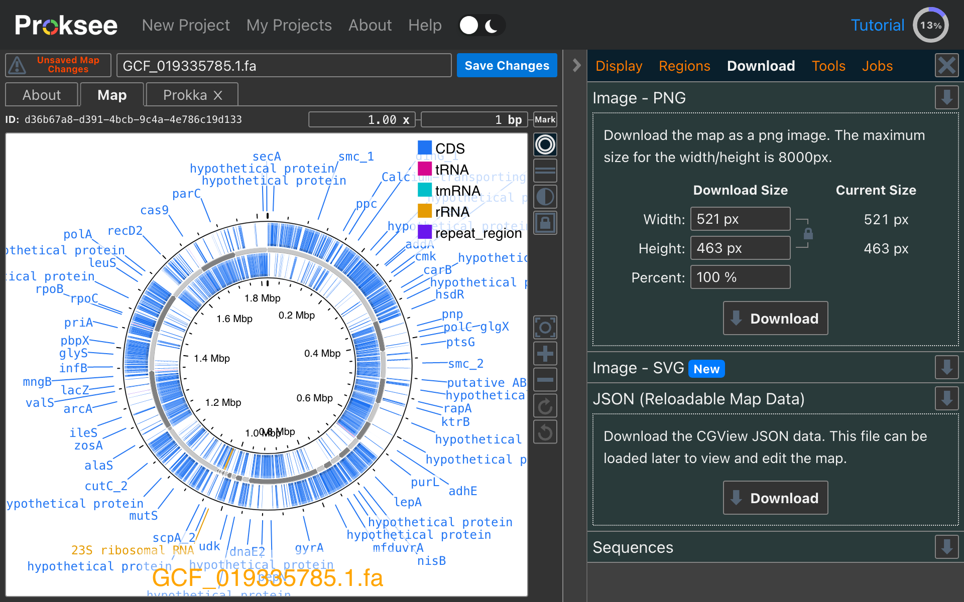 - JSON: Download a JSON file for the map. This provides an archive of the map that can be loaded into Proksee in the future.