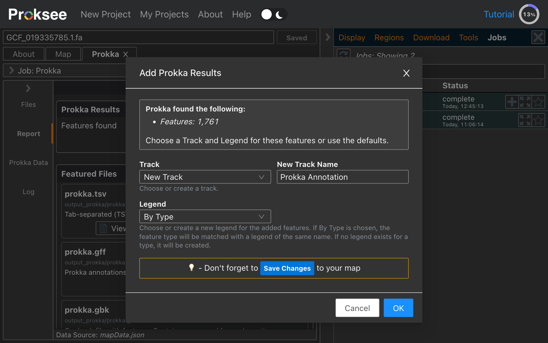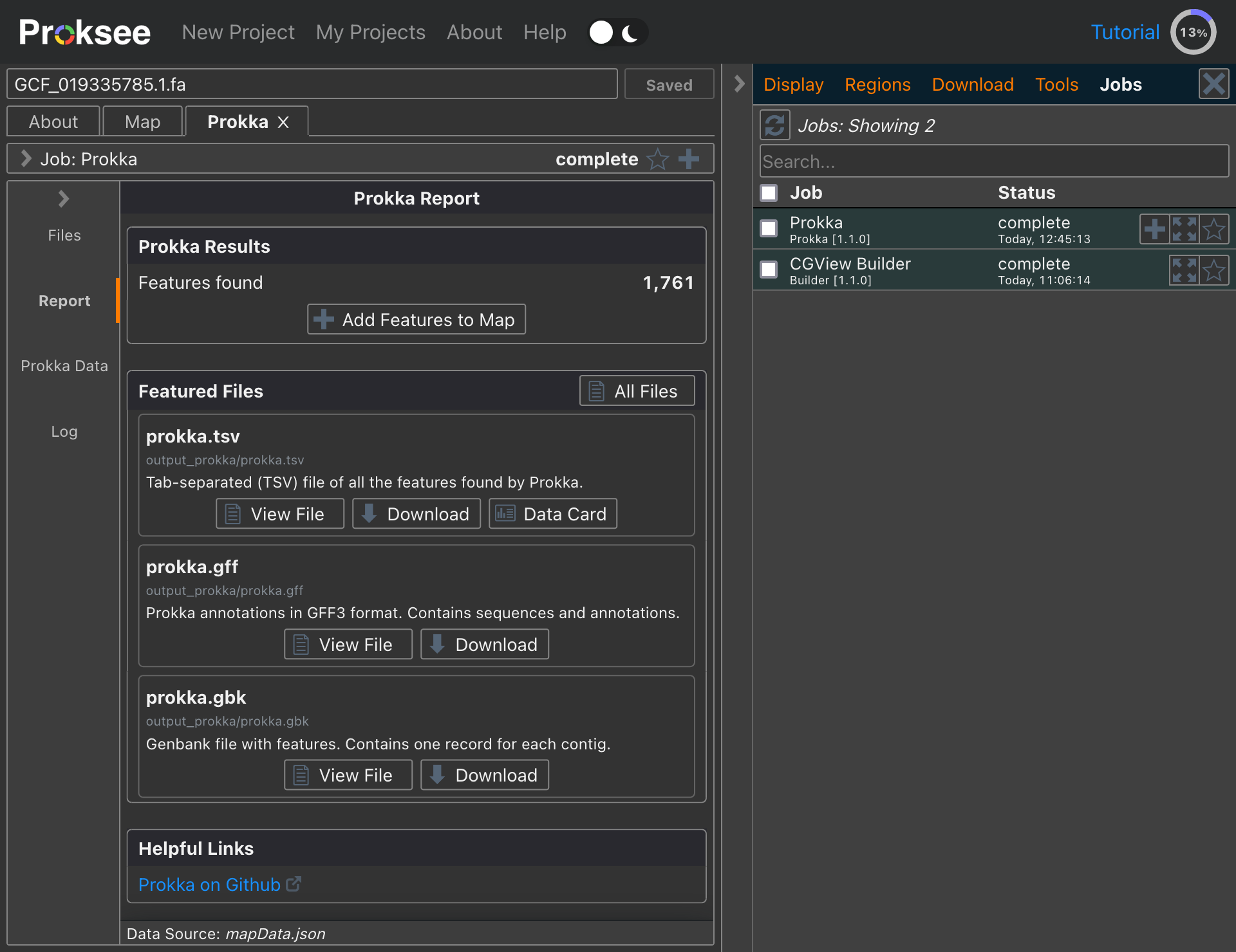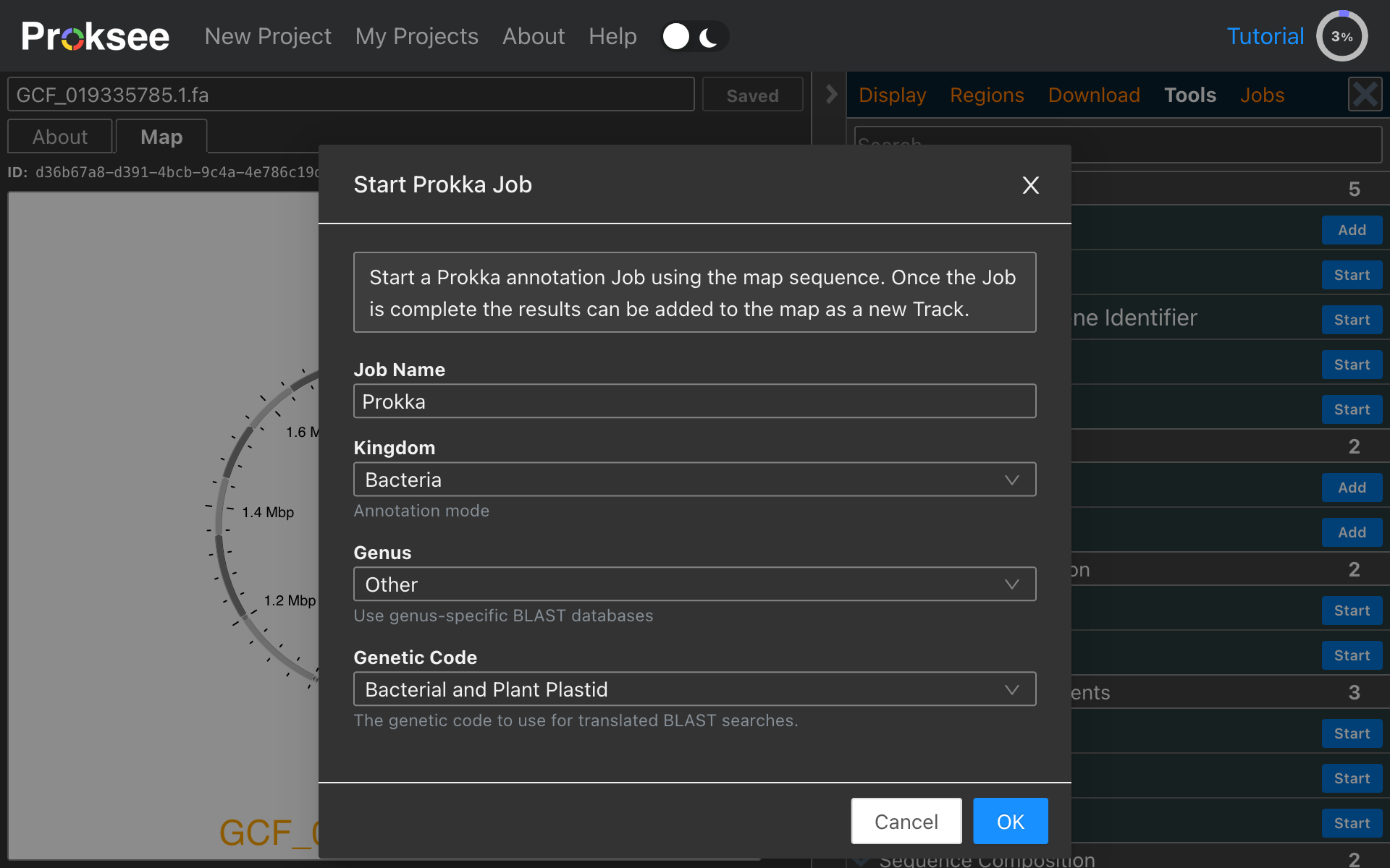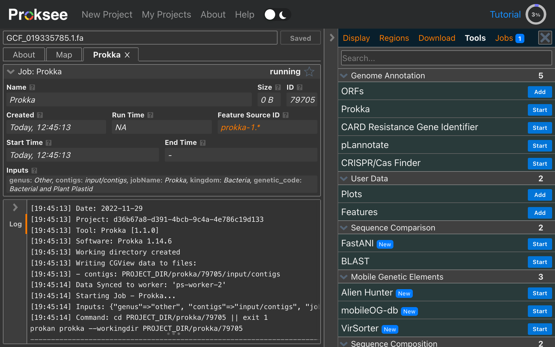 - In the Sidebar Tools panel, find the Prokka tool and click Start.